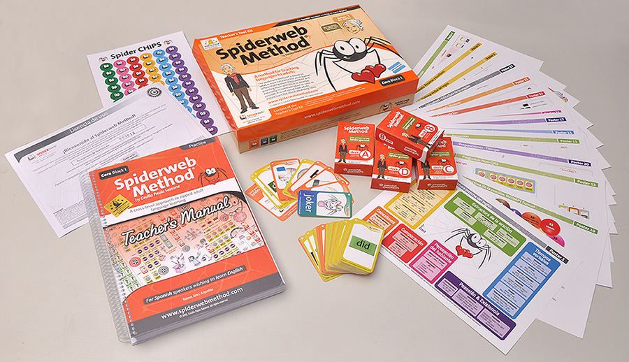 • El método consta de tres "core blocks" o bloques: estructuras, vocabulario y habilidades. Este Kit corresponde al Core Block 1, que da nombre al Spiderweb Method®, ya que presenta la estructura del idioma o matriz idiomática como una telaraña lógica y fácil de comprender y utilizar.